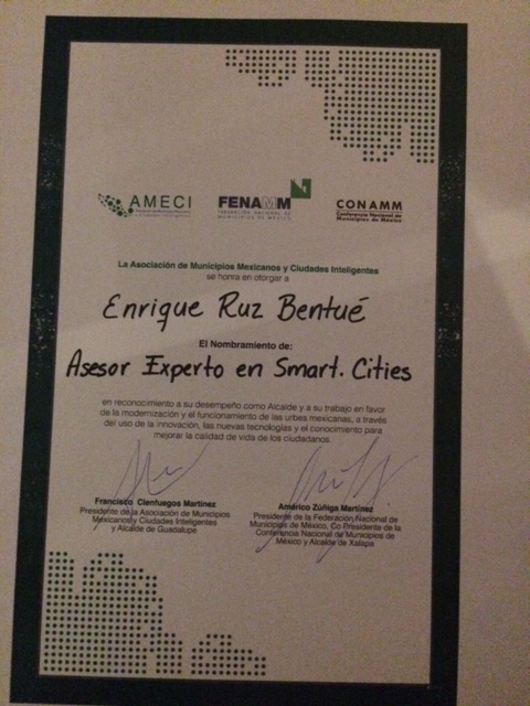 El Presidente de AMECI y Alcalde de Guadalupe Lic. Francisco Cienfuegos, me entrega el reconocimiento como Asesor Experto en Smart City de la Asociación cuya constitución surge de la sugerencia que yo había hecho dos años atrás al Director Ejecutivo de la CONAMM el Lic. Sergio Arredondo.